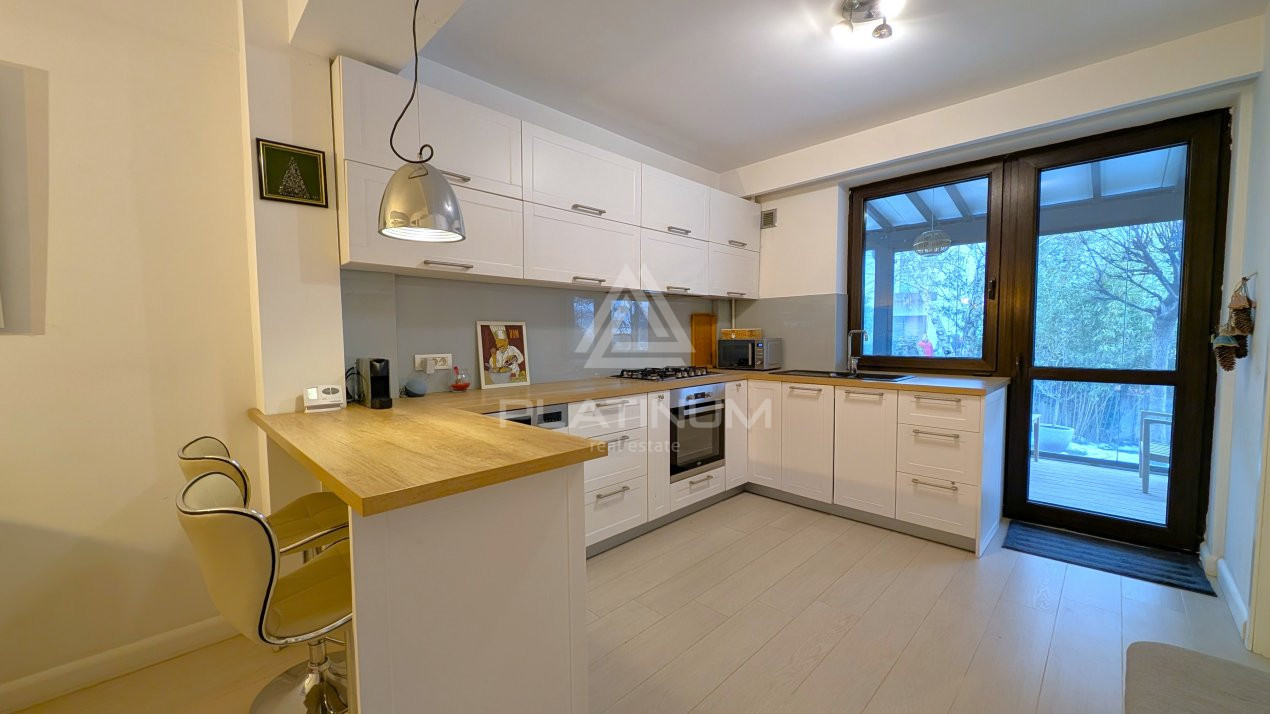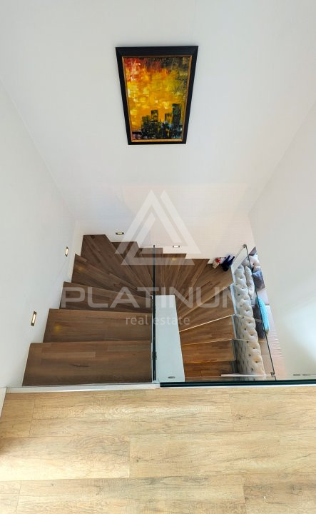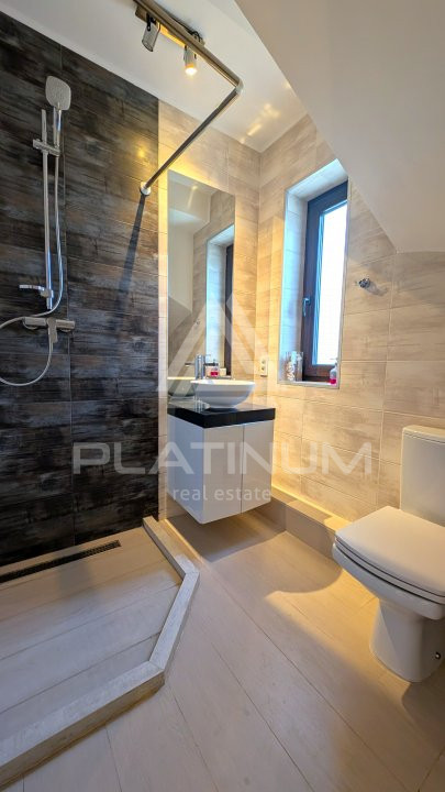Open space generos: living, zona de dining și bucătărie integrate armonios. Din bucătărie ai acces direct pe o terasă de 12 m², acoperită și închisă cu sticlă retractabilă – o extensie a locuinței pe care o poți folosi în orice anotimp. Terasa este placată cu WPC. Completează parterul o baie cu duș și o cameră tehnică.