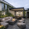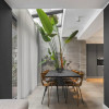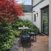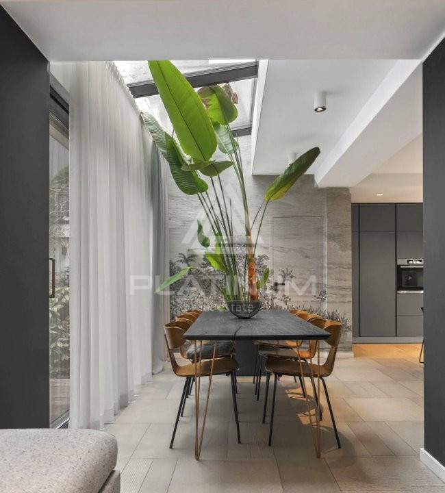 - Living generos cu zonă de dining și deschidere către curtea amenajată cu deck și vegetație